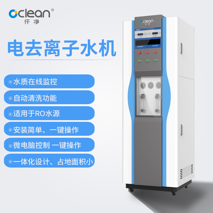 自来水经过纤维过滤器过滤去除水中的粗颗粒杂质,再用RO离子膜过滤去除水中99%以上的离子,再通过仟净EDI电离模组,去除水中剩余的离子,即可达到电导率0.1us/cm,即RO过滤技术+EDI技术相结合,达到节能,出水质量好,使用经济实惠等特点。